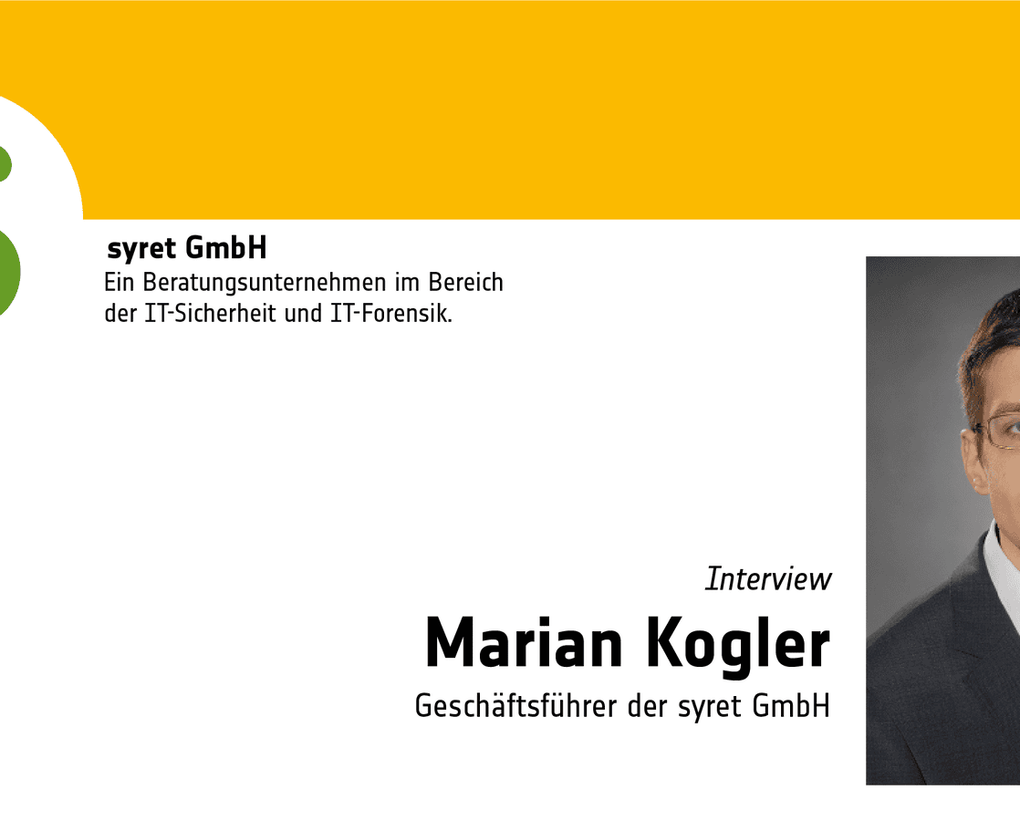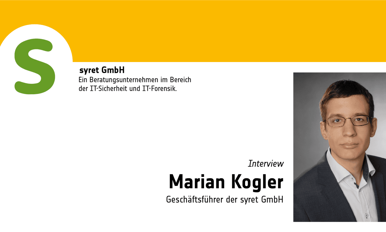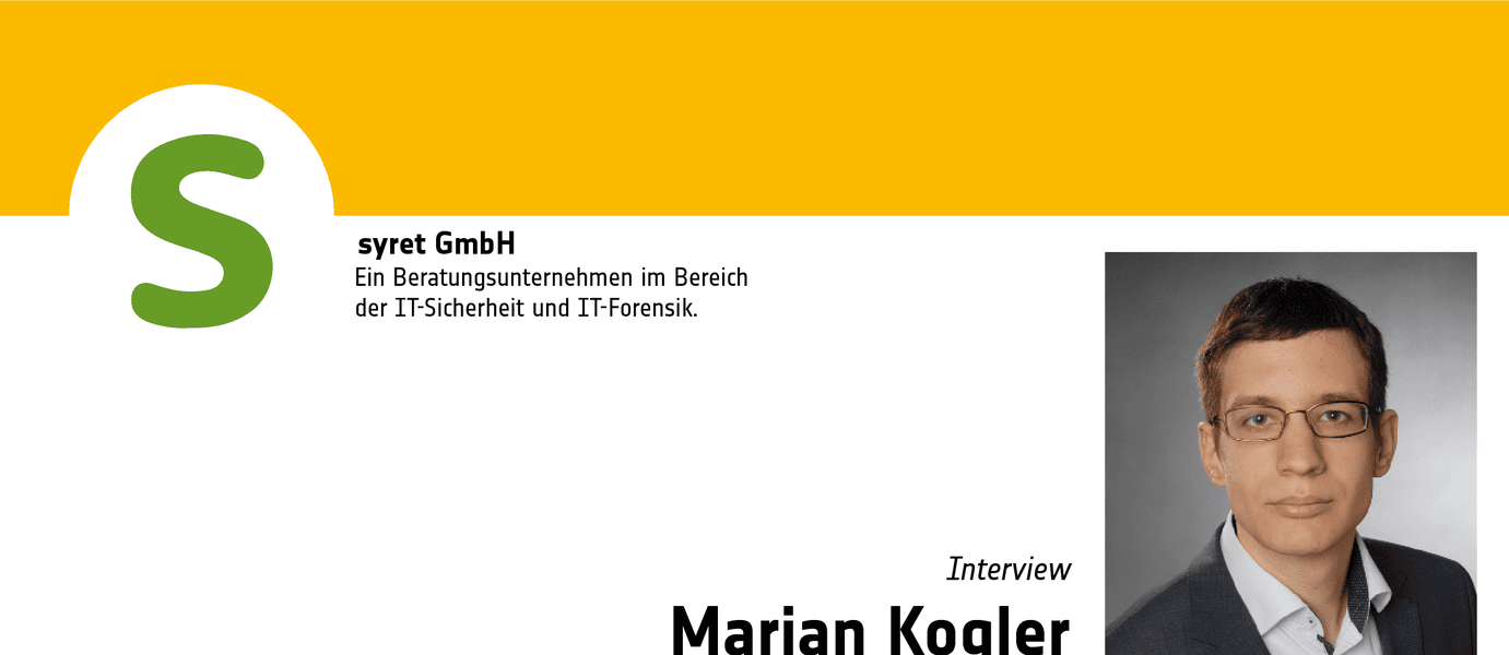 Marian Kogler is Managing Director of syret GmbH, an IT security company based in Halle an der Saale. Together with his team, he advises companies in various sectors, including banks, and public institutions in German-speaking countries on all IT security issues, conducts penetration tests (simulated attacks on systems carried out with the owner’s consent to find vulnerabilities) and investigates IT security incidents.