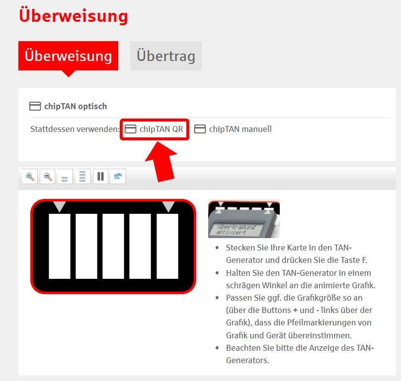 Im Online-Banking Ihrer Sparkasse müssen Sie bei einer Überweisung nur auf „chipTAN-QR“ klicken – fertig. Beim nächsten Mal wird Ihnen automatisch wieder chipTAN QR angeboten.
