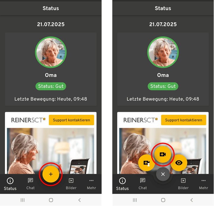 In der SUSY-App via Videoanruf über den gelben + Button im Hauptscreen (siehe rote Markierungen).